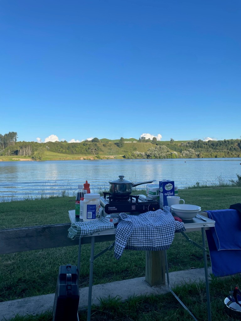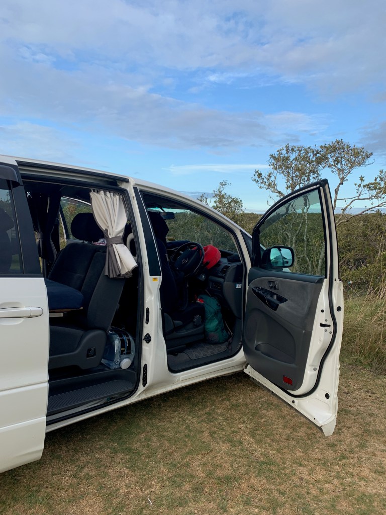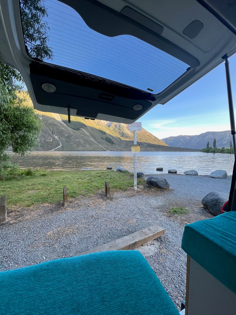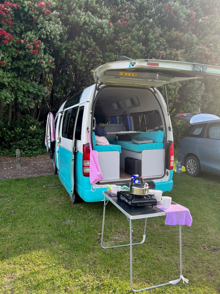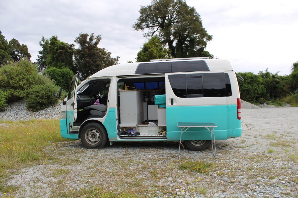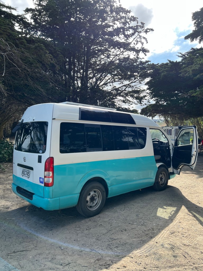 The one huge difference this time was that our van was Certified Self-Contained. This is essential for camping in New Zealand as this means you’re able to freedom camp! By being Self-Contained the van doesn’t release any waste water from it’s internal kitchen tap, it just holds it in a tank until you go to a dumping station and let it out. It will also have a toilet, even though our’s was just a pop up potty and we didn’t use it as we just used public toilets or stayed on sites that had toilets.