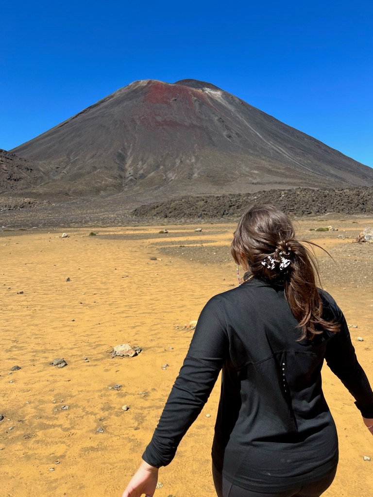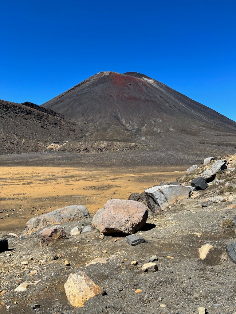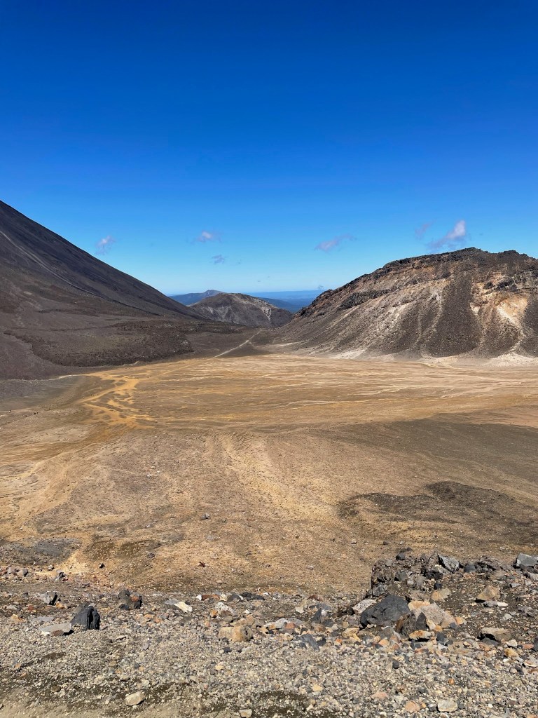 Before you climb the next large incline, you’ll come to a flat valley which is at the base of Mount Ngauruhoe. It is a huge space, and makes a great spot for taking some photos and catching your breath. I like this part of the hike as you’ve climbed a big part of the incline, the views are impressive as you’re in a big yellow valley and you can see the peak.