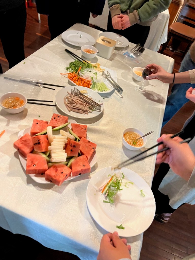 Once everyone was on board, the boat left the port quickly whilst we met the rest of our group and had the welcome talk. We had a lovely mix of ages, a couple of older ladies, 2 young backpackers, an American couple on their honeymoon and a german family with an adorable baby boy called Milo. The welcome talk was short, as we had had a brief overview when we arrived at the port, but our guide explained our itinerary again and as we listened we cruised through the first peaks of the bay. Our first meal was also as soon as we were setting off as we were behind schedule with the typhoon warning. Lunch was a selection of food such as spring and summer rolls, fresh prawns, dumplings and salads.